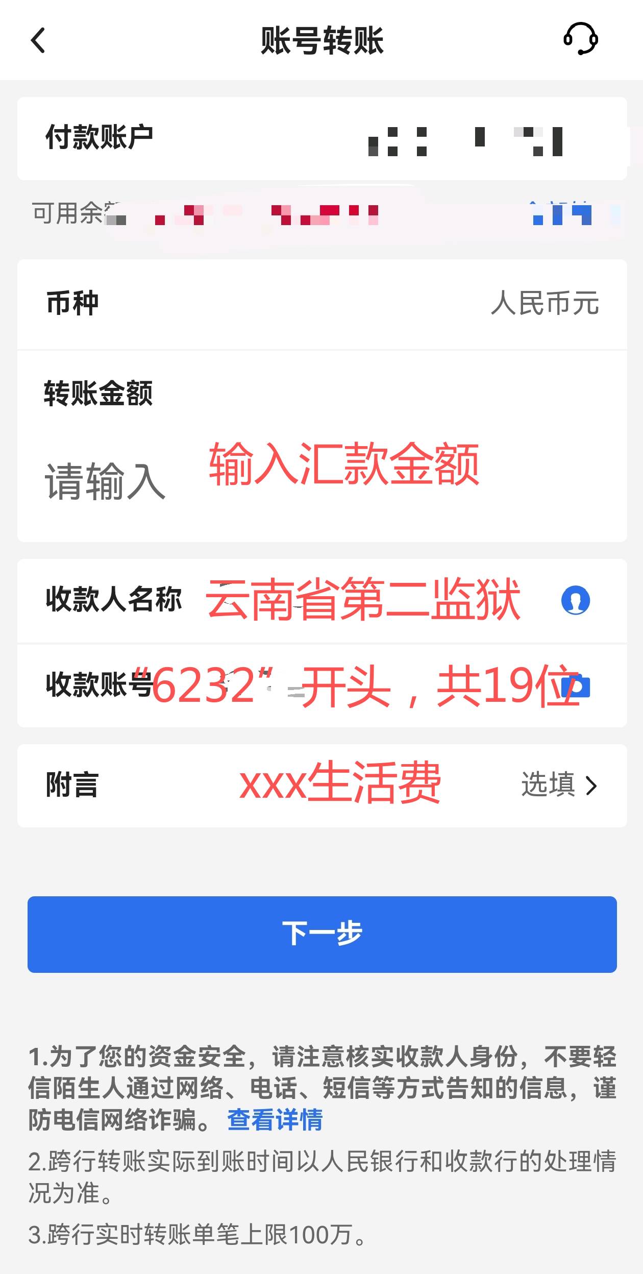 第二步:输入监狱收款户名:“云南省第二监狱”和收款账号:“6232xxxxxxxxxxxxxxx”,选择“收款银行”和“付款账户”,输入转账金额和附言。