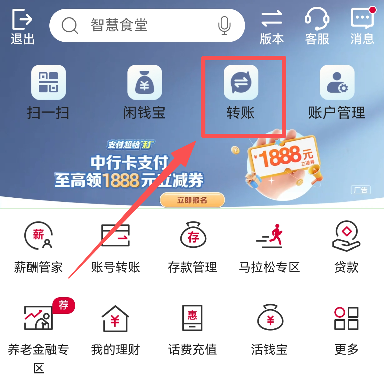 第一步:登陆手机银行,在首页选择“转账汇款”。